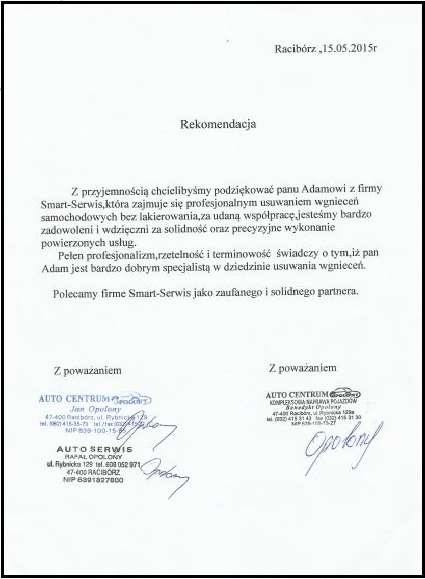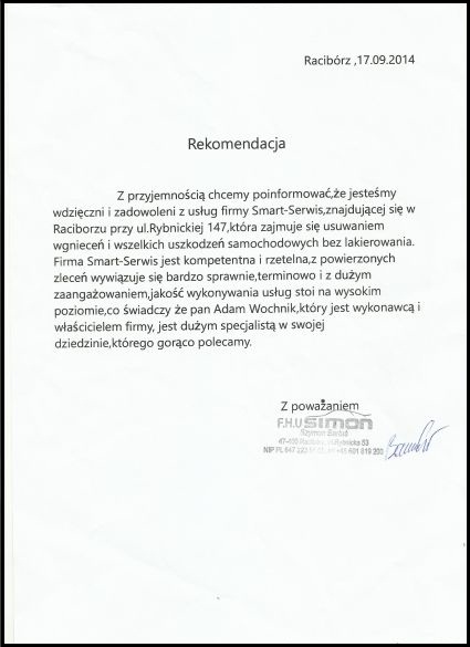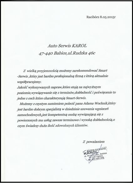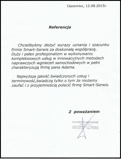 Lakier w obrębie wgniecenia nie może być pęknięty! W przypadku pękniętego lakieru firma oferuje naprawę wgniecenia niekonwencjonalną metodą "push to paint" (przygotowanie wgniecenia do lakierowania bez konieczności szpachlowania).